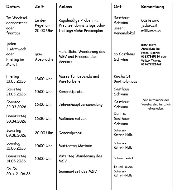 Termine 2026, MGV "Deutsche Eintracht Schwarzenholz" e. V.