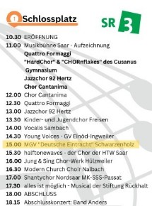 Dieses mal fand unser Auftritt auf der SR 3 Bühne am Schlossplatz statt, eine von neun Bühnen, auf der wir in der Sparte Männerchöre uns einreihten in die große Zahl der Kinder-, Jugend und Erwachsenenchöre und Ensembles für alle Liebhaber der Chormusik.