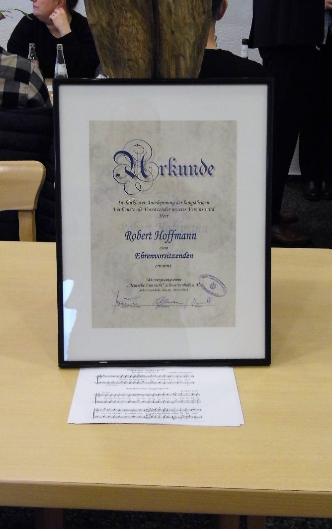 „Wer dafür ist, dass wir Robert Hoffmann zum Ehrenvorsitzenden des MGV „Deutsche Eintracht“ Schwarzenholz ernennen, den bitte ich um Handzeichen.“