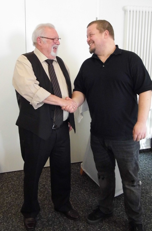 Günter Maurer gratuliert Robert Hoffmann und überreicht die Urkunde.